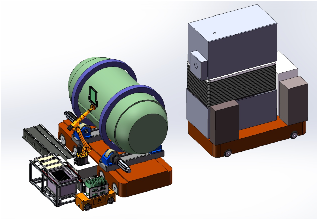 固鸿公司新研发的智能加速器射线照相系统,采用了智能AGV为加速器和被检工件的承载平台,配备自动换片装置,从而使加速器位置调整、工件位置调整以及更换胶片的动作全部实现了自动化,进而实现自动连续拍照,节省了换片时间,大大提升了检测工作效率。